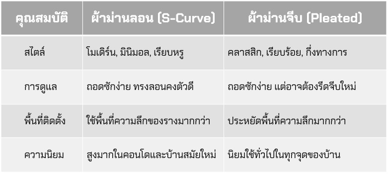 - ผ้าที่มีน้ำหนัก: เช่น ผ้ากันแสง (Blackout) หรือผ้าใยสังเคราะห์ที่มีความทิ้งตัวดี จะทำให้ลอนดูอิ่มและไม่บานออก
