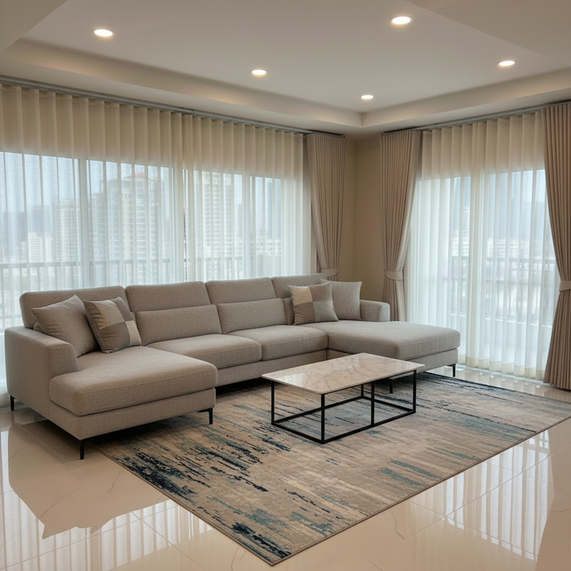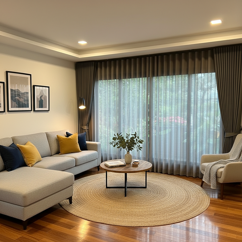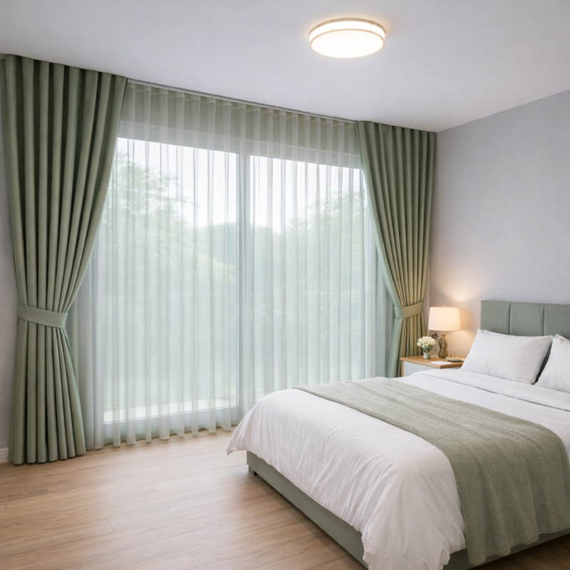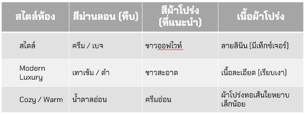 - ผ้าโปร่ง (Sheer): นิยมทำเป็นม่านลอนซ้อนด้านใน ช่วยกรองแสงให้ดูละมุนและเพิ่มมิติให้กับห้อง